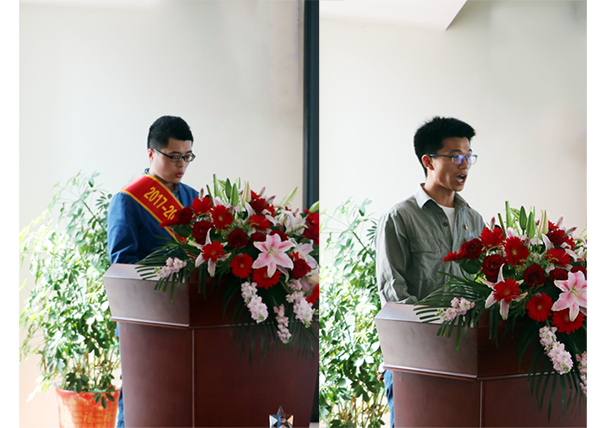 劳动模范代表汲传奇和优秀青年代表单国庆上台发言