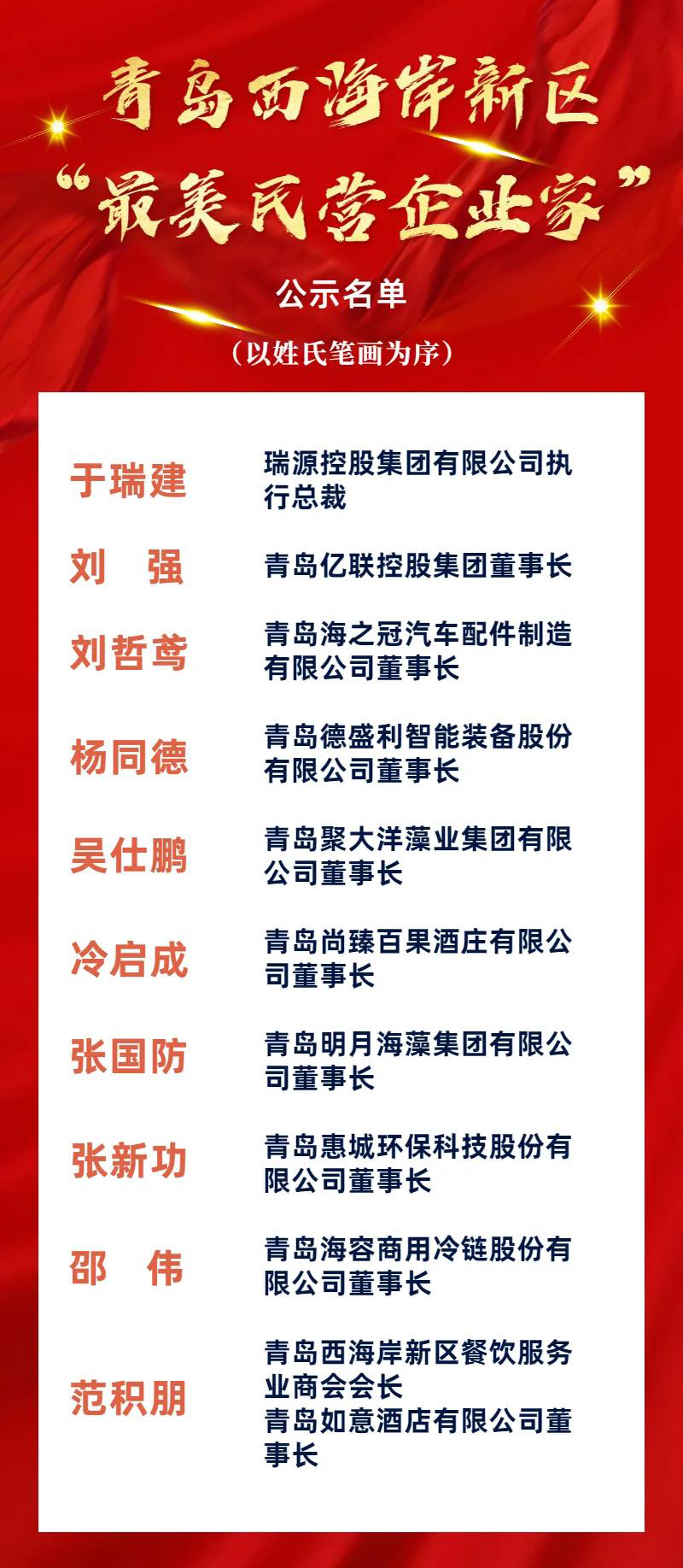 近日,工委区委统战部、工委区委宣传部、区工商业联合会(区民营经济发展局)联合开展青岛西海岸新区“最美民营企业家”评选活动。经过广泛宣传发动、优秀典型推荐、综合评价、联合评分等程序,评选出10名青岛西海岸新区“最美民营企业家”,青岛拼搏体育科技股份有限公司董事长、总经理张新功入选。