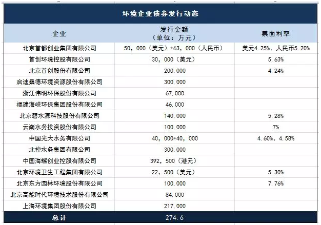 对于环境企业而言,发行债券是一种常见的融资手段,据不完全统计,2018年以来,环保上市企业的债券发行规模至少达到274.6亿元人民币。