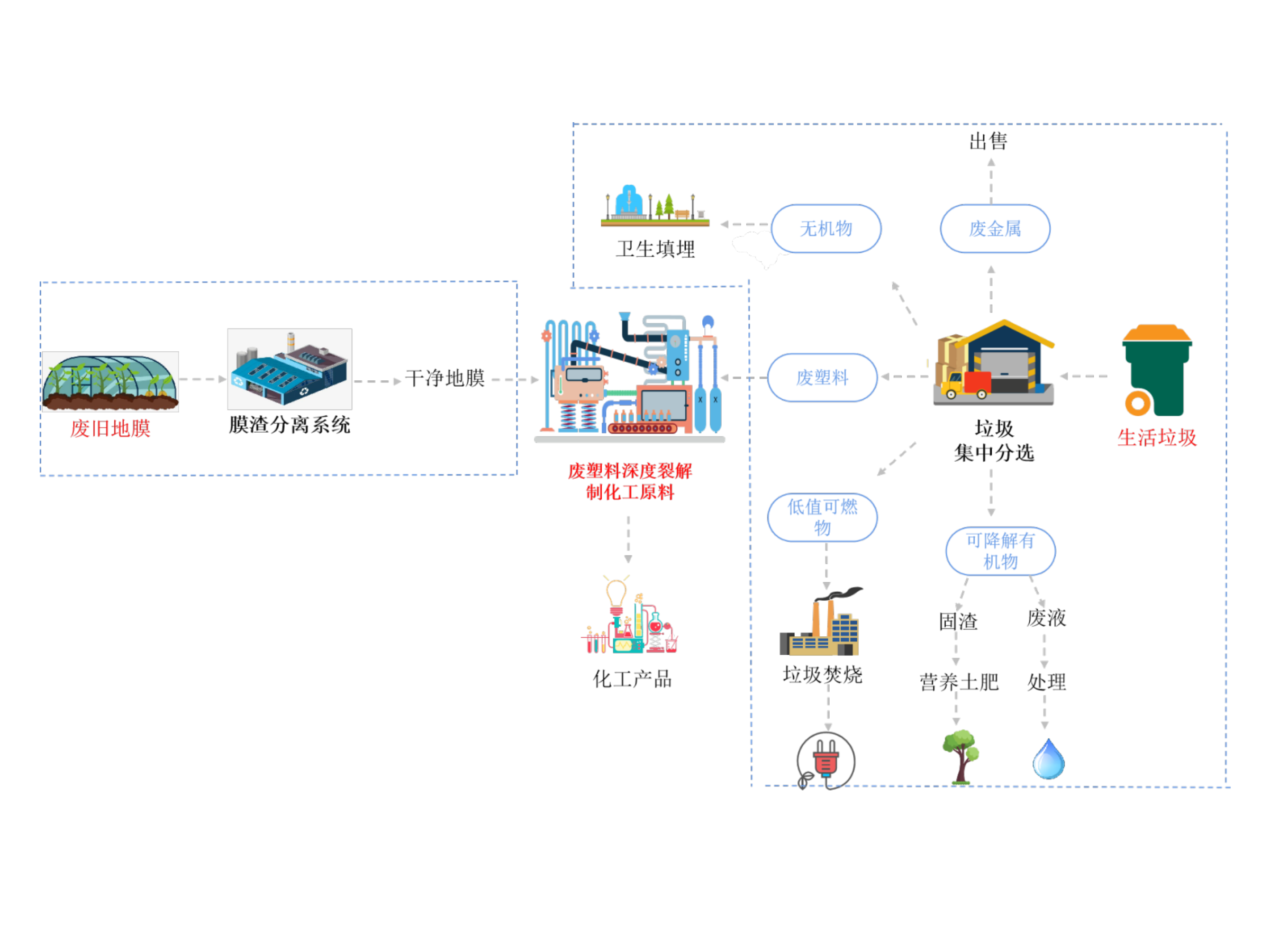 垃圾集中机械化自动分选技术由拼搏体育技术团队自主研发,更注重的是垃圾中端的处理,因为末端的处理方式只能是填埋焚烧。通过精细化集约式的高效分选体系,将生产、生活中的废塑料全量回收再利用,可将金属、无机物、有机液和低值混合可燃物进行一次性分离,分选获得的物料,部分可直接作为产品进行出售,其他高值化垃圾可经过其他手段重新加工为合格的再循环利用产品;再对低值的塑料进行二次精分,经过拼搏体育自主研发的另一项创新技术——混合废塑料深度催化裂解(CPDCC)技术可转化为高清洁化工原料,构成了废塑料全闭环的产业链条。